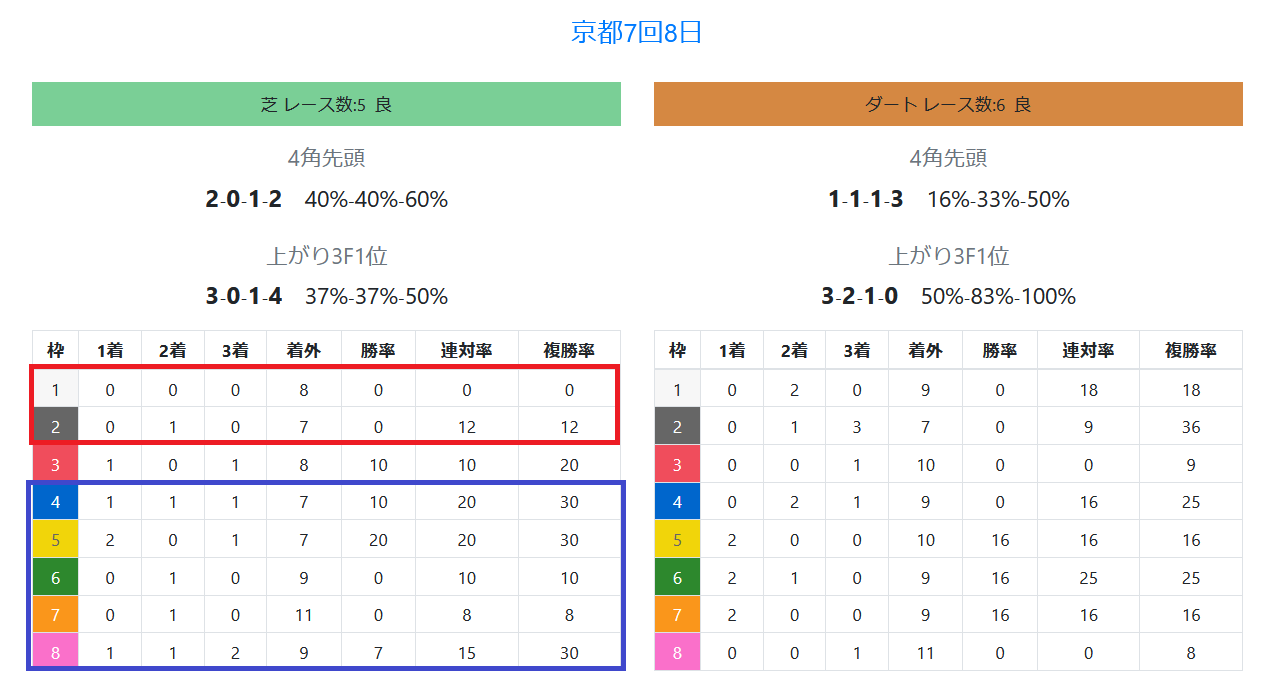 「インスタグラム」「ツイッター」に書いた通り、2枠、4~6枠が2勝ずつ。8枠が0勝、連対率&複勝率が一桁台。極端な外枠は不利。