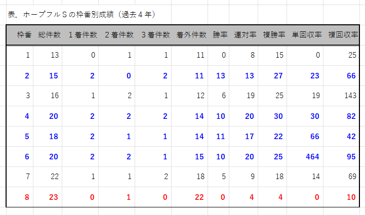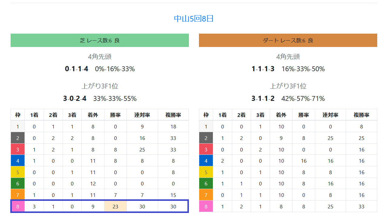 「インスタグラム」「ツイッター」に書いた通り、2枠、4~6枠が2勝ずつ。8枠が0勝、連対率&複勝率が一桁台。極端な外枠は不利。