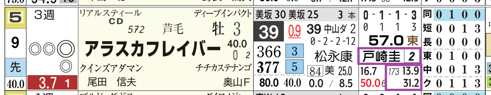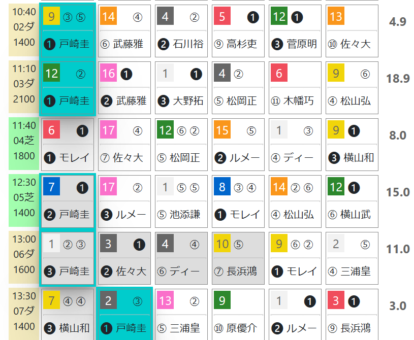 「騎手の該当競馬場の成績」=勝ち数1位、勝率34.4%&複勝率67.5%(157レース)