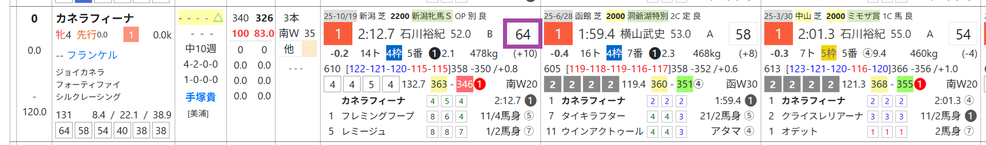 カネラフィーナは6戦4勝&2着2回とパーフェクト連対、新潟牝馬Sを上がり最速でⅤ、レースラップのラスト2F11秒台と優秀。