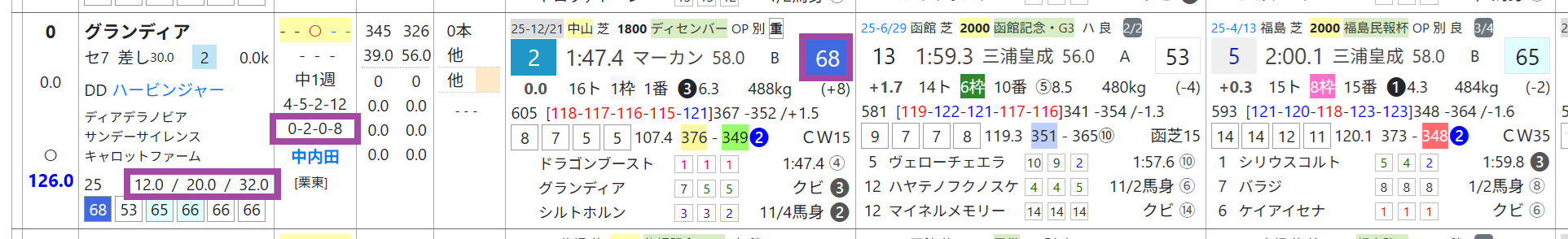 グランヴィアはオープン&重賞で2着2回、ディセンバーSで「ハイブリッド指数」=《68》をマークして2着、中内田厩舎は中山の芝の勝率12%&複勝率32%と上々。