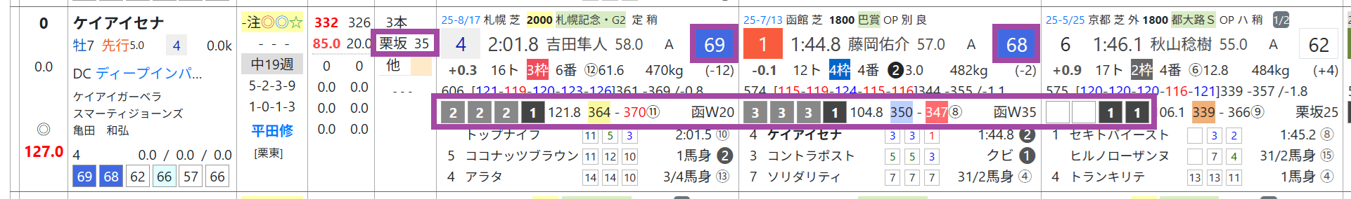 ケイアイセナは近3走すべて4角2番手以内、近2走は北海道で「ハイブリッド指数」=《60》台後半、1週前の「追切指数」=《35》と上々。