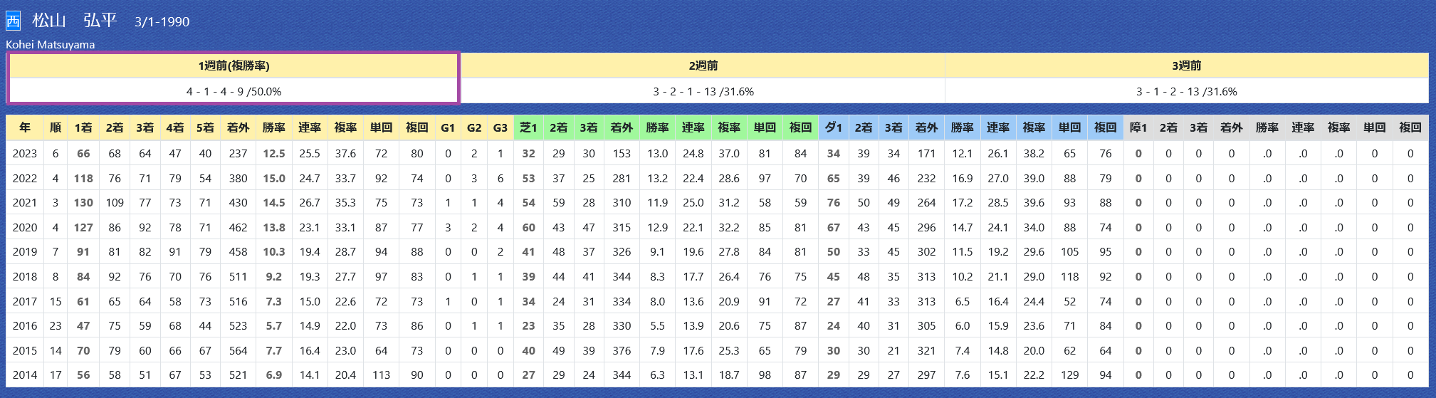 「厩舎の該当競馬場の成績」=勝ち数8位、勝率15.4%&複勝率61.5%
