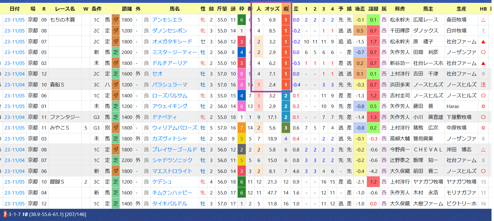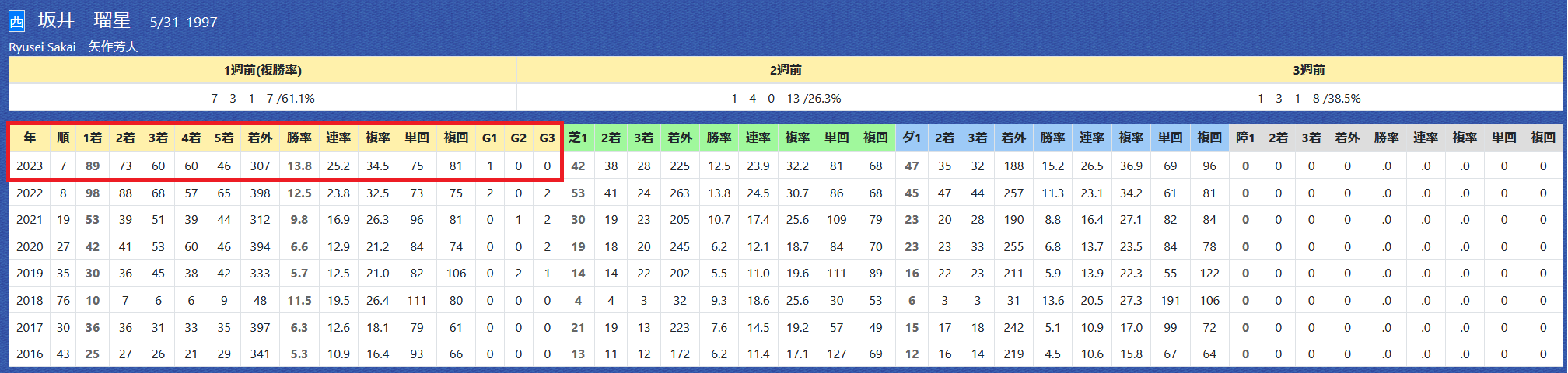 2023年11月07日 【データ分析】坂井瑠星騎手 【坂井瑠星騎手先週の京都で8勝の固め打ち。7勝が1人気以外。先週の成績今年は自身初の100勝達成へ。エリザベス女王杯はアートハウスで参戦。年度別成績→トップページからログイン→「HBビューワ」→「騎手成績」※会員登録(無料)で利用可能⇒「インスタグラム」「ツイッター」にて他情報も更新中 「データ分析」カテゴリの最新記事