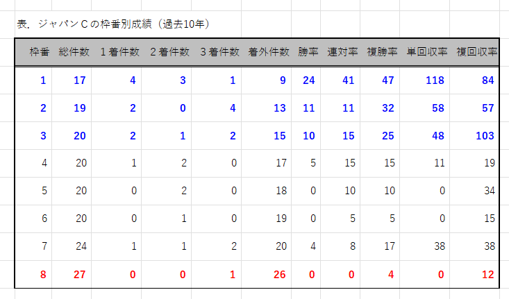 2023年11月20日 【データ分析】ジャパンCの枠番別成績 【ジャパンCの枠番別成績】1枠が半数近くの4勝、単勝回収率100%超え。2枠&3枠が2勝で次点。近7年はすべて勝ち馬は1~3枠。8枠は0連対。明らかに内枠有利。⇒「インスタグラム」「ツイッター」にて他情報も更新中 「データ分析」カテゴリの最新記事