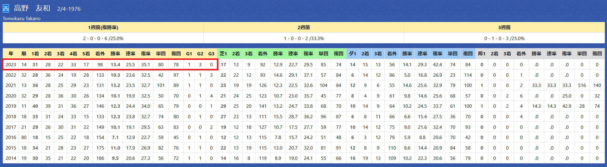 2023年11月22日 【データ分析】高野友和厩舎 【高野友和厩舎】ナミュールでマイルCSを制覇。先週の成績一昨年の大阪杯のレイパパレ、昨年の秋華賞のスタニングローズに次いで、3年連続のGⅠ制覇。全GⅠ5勝は牝馬であげたもの。年度別成績→トップページからログイン→「HBビューワ」→「厩舎成績」※会員登録(無料)で利用可能⇒「インスタグラム」「ツイッター」にて他情報も更新中 「データ分析」カテゴリの最新記事