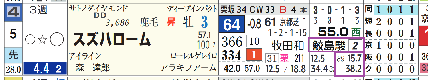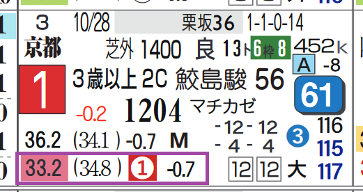 2023年11月26日 【レース予想】京都10R・清水S(3歳上3勝クラス) 【京都10R・清水S(3歳上3勝クラス)】⑤スズハロームは2勝クラスを断トツ上がりで差し切り。上がり最速(上がり2位に0.7秒差)鮫島駿騎手は京都の芝の勝ち数が2位と優秀。「騎手の該当競馬場の成績」=勝ち数2位、勝率15.7%&複勝率38.2%(89レース)3勝クラスでは末脚は通用していい。「推定後半3ハロン」1位*画像は「ハイブリッド新聞(PC版)」の【推定3ハロン分析シート】 ⇒「インスタグラム」「ツイッター」にて他情報も更新中 「レース予想」カテゴリの最新記事