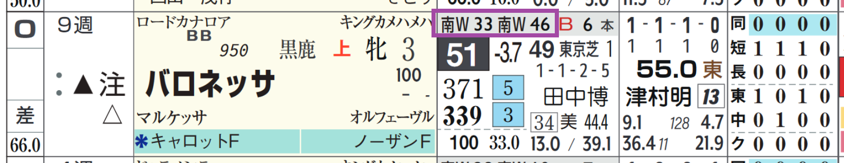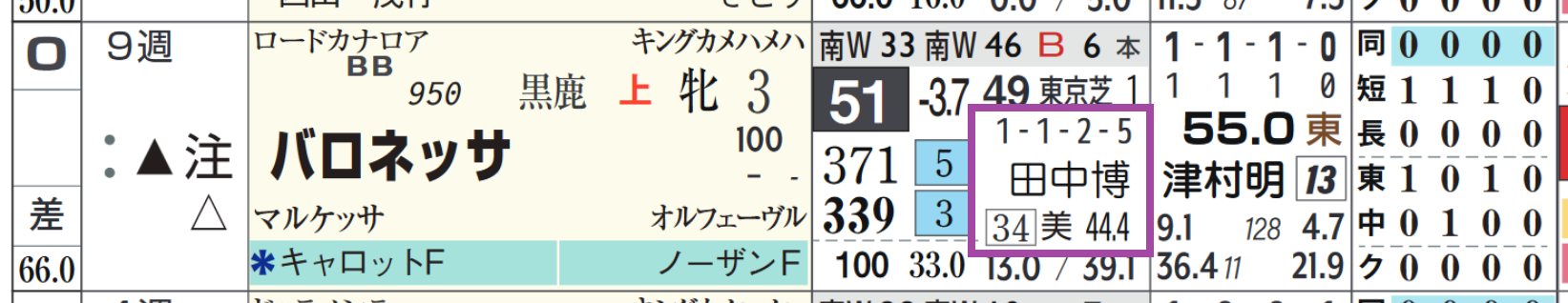 「近4開催の厩舎成績」=【1・1・2・5】、「複勝率」=《44.4%》