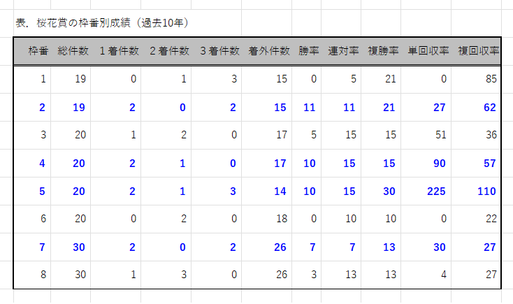 「インスタグラム」「ツイッター」に書いた通り、2枠、4枠、5枠、7枠が2勝ずつ。枠順による有利・不利はほとんどない。