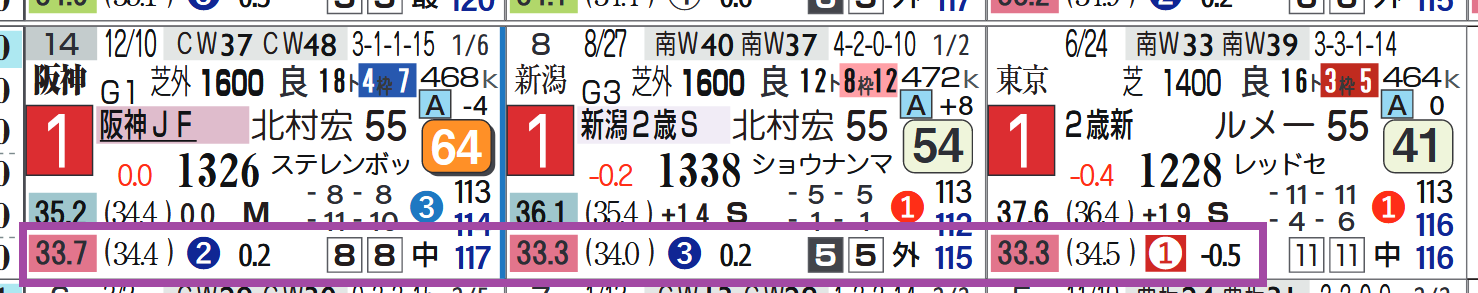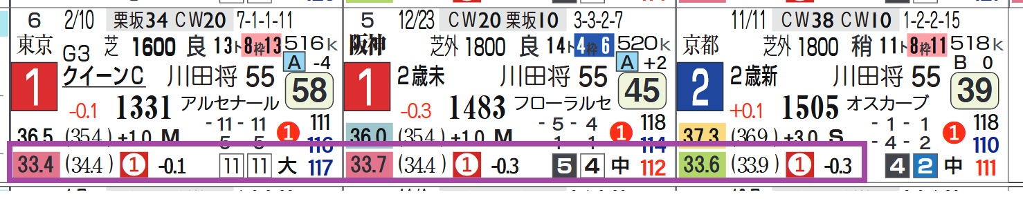 ⑱チェルヴィニアは3走すべてレースラップのラスト1ハロンが秀逸。