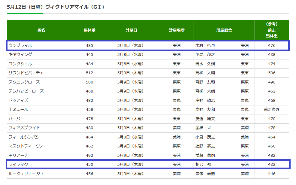 2024年05月09日 【データ分析】ヴィクトリアMの調教後の馬体重 【ヴィクトリアMの調教後の馬体重】ライラックは前走の大幅馬体減が回復。ウンブライルの馬体増も好印象。マスクトディーヴァ&ナミュールも前走と同程度。⇒「インスタグラム」「ツイッター」にて他情報も更新中 「データ分析」カテゴリの最新記事