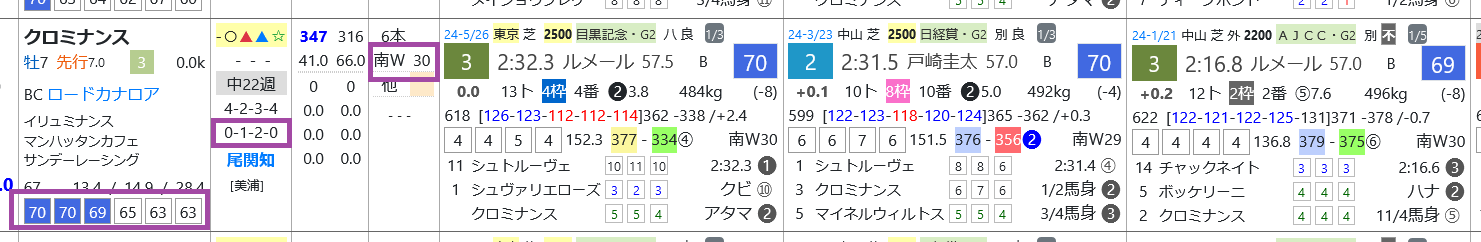 クロミナンスはオープン&重賞で3戦すべて2着&3着、近2走は「ハイブリッド指数」=《70》をマーク、1週前の「追切指数」=《30》と上々。