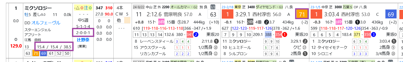 ミクソロジーはオープン&重賞で3戦2勝、昨年のダイヤモンドSで「ハイブリッド指数」=《71》をマークして1着、辻野厩舎は東京の芝で勝率15%&複勝率38%と上々。