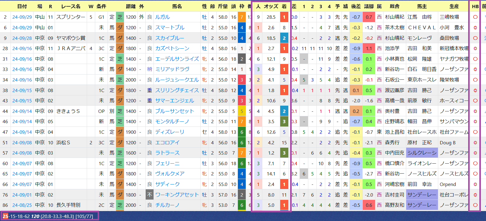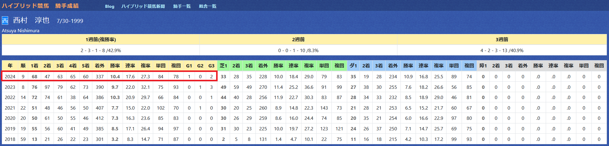 2024年09月30日 【データ分析】西村淳也騎手 【西村淳也騎手】デビュー7年目、スプリンターズSのルガルでGⅠ初制覇。年度別成績「ハイブリッド指数」2番手以内で勝率20%&複勝率48%、単勝回収率100%超え。毎日王冠はエルトンバローズで杉山晴紀厩舎のコンビで参戦。「ハイブリッド指数」2番手以内の成績→トップページからログイン→「HBビューワ」→「騎手成績」※会員登録(無料)で利用可能⇒「インスタグラム」「ツイッター」にて他情報も更新中 「データ分析」カテゴリの最新記事