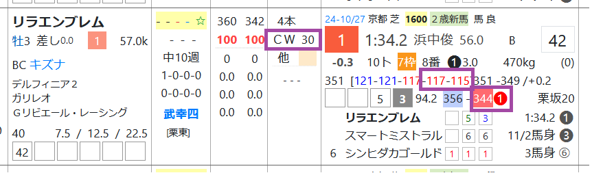 リラエンブレムは新馬戦で上がり最速をマークして1着、レースラップのラスト3ハロンすべて11秒台、CWで1週前の「追切指数」=《30》と上々。