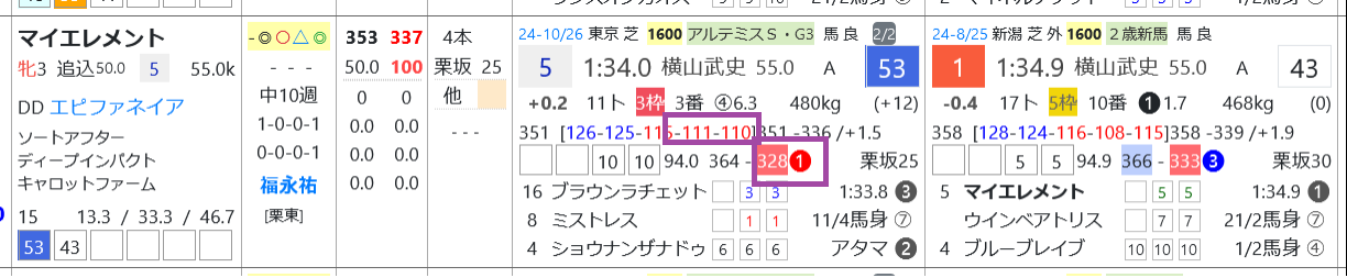 マイエレメントは新馬戦が「レースレベル」=《A》とハイレベル、アルテミスSで上がり最速をマークして5着、レースラップのラスト2ハロンが11秒台前半と優秀。