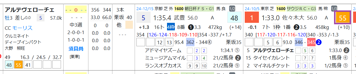 アルテヴェローチェはサウジアラビアRCで「ハイブリッド指数」=《55》をマークして重賞初制覇、朝日杯FSは単勝3倍台の1人気で5着、坂路で「追切指数」=《40》と優秀。