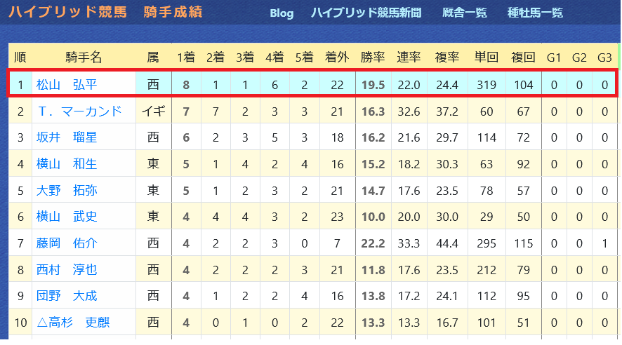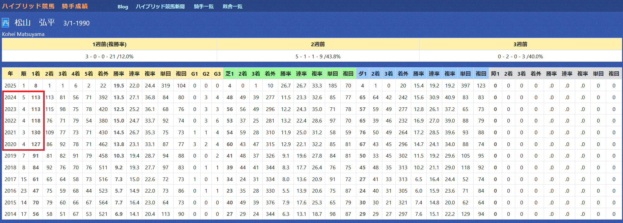 2025年01月14日 【データ分析】松山弘平騎手 【松山弘平騎手】5年連続して100勝超え、リーディング3~5位。年度別成績2週でリーディング1位。4年ぶりのGⅠ制覇なるか。騎手リーディング→トップページからログイン→「HBビューワ」→「騎手成績」※会員登録(無料)で利用可能⇒「インスタグラム」「ツイッター」にて他情報も更新中 「データ分析」カテゴリの最新記事