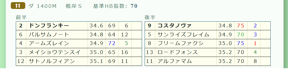 2025年02月02日 【レース予想】東京11R・根岸S(G3) 【東京11R・根岸S(G3)】⑨コスタノヴァは同舞台の欅Sが秀逸。「レースレベル」=《S》、「ハイブリッド指数」=《78》東京のダートは4戦4勝と好相性。「コース実績」=【4・0・0・0】得意のコースなら鋭く伸びてくるはず。「推定後半3ハロン」1位*画像は「ハイブリッド新聞(PC版)」の【推定3ハロン分析シート】 木村厩舎は東京のダートの複勝率50%超えと優秀。「厩舎の該当競馬場の成績」=勝ち数13位、勝率26.3%&複勝率57.9%⇒「インスタグラム」「ツイッター」にて他情報も更新中 「レース予想」カテゴリの最新記事