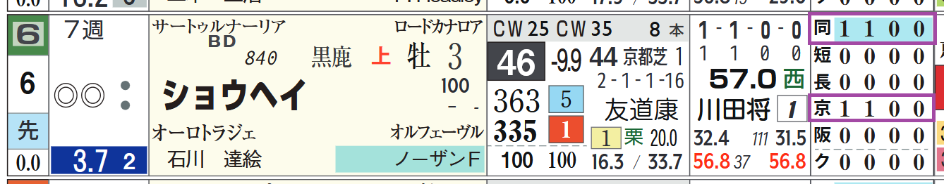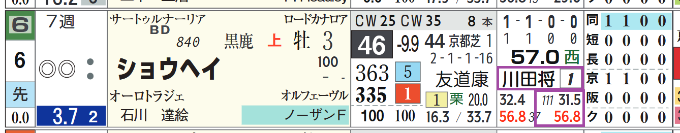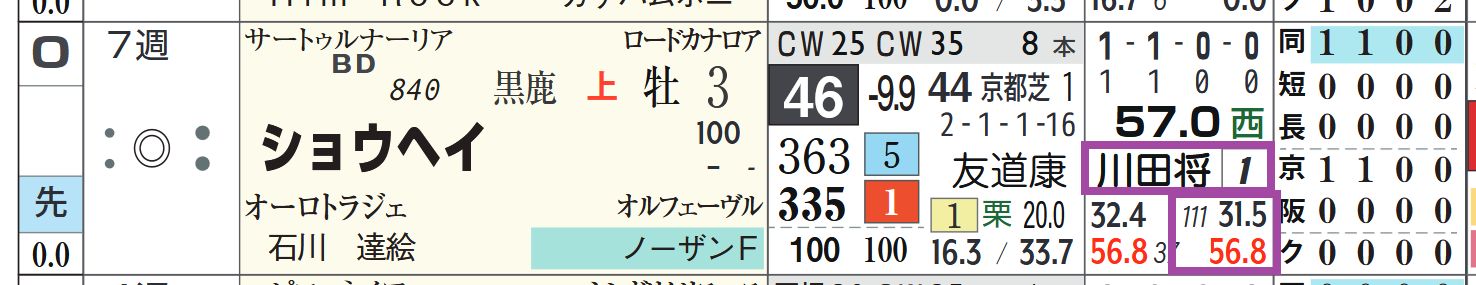 ⑥ショウヘイは新馬戦のレースラップのラスト1ハロンが10秒台と秀逸。