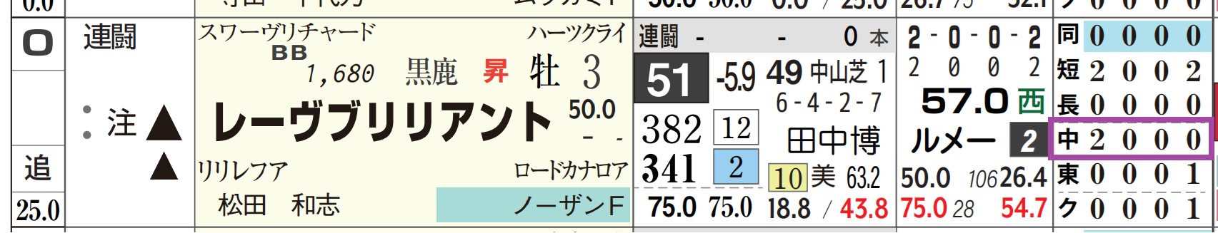 「厩舎の該当競馬場の成績」=勝ち数63位、勝率0.0%&複勝率25.0%
