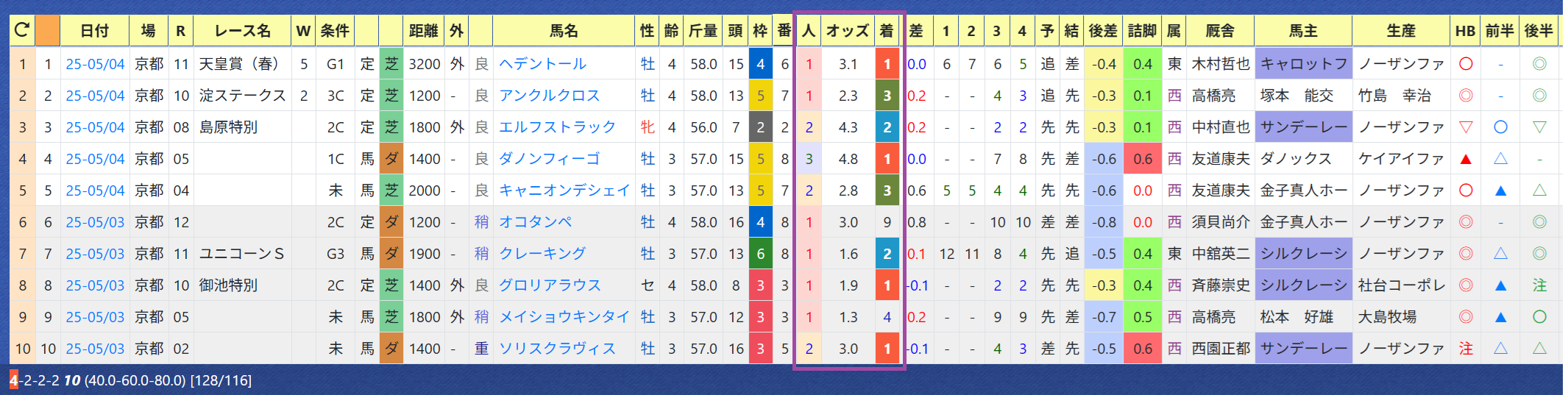 「近4開催の厩舎成績」=【3・2・3・12】、「複勝率」=《40.0%》