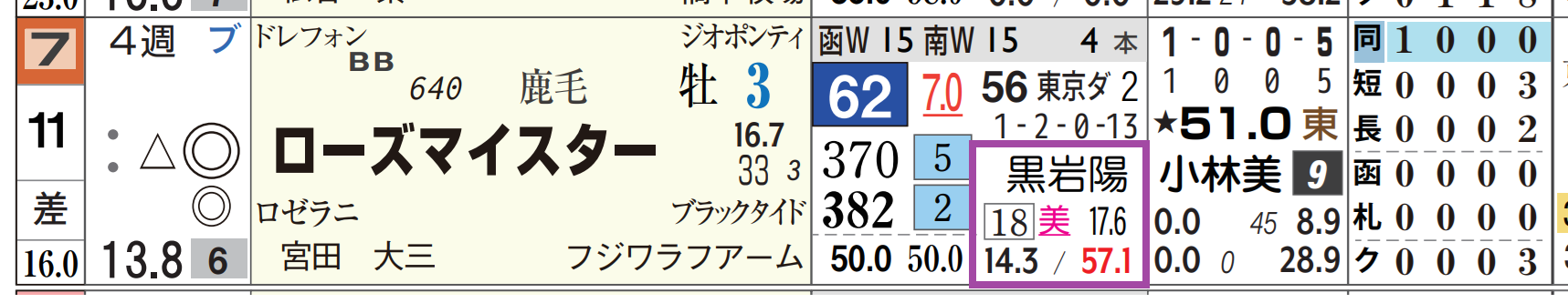 2025年07月06日 【レース予想】函館8R・3歳上1勝クラス 【函館8R・3歳上1勝クラス】⑪ローズマイスターは2走前がハイレベル戦で小差に善戦。「レースレベル」=《S》、「ハイブリッド指数」=《56》黒岩厩舎は函館のダートの複勝率50%超えと優秀。「厩舎の該当競馬場の成績」=勝ち数18位、勝率14.3%&複勝率57.1%ドレフォン産駒は函館のダートの中~長距離の成績&回収率が上々。予想6人気、「血統評価」=成績B&回収率B⇒「インスタグラム」「ツイッター」にて他情報も更新中 「レース予想」カテゴリの最新記事