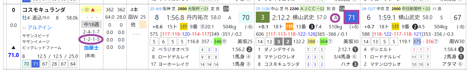 コスモキュランダはオープン&重賞で馬券絡み4回、AJCCが「レースレベル」=《A》とハイレベル、「ハイブリッド指数」=《73》をマークして3着。