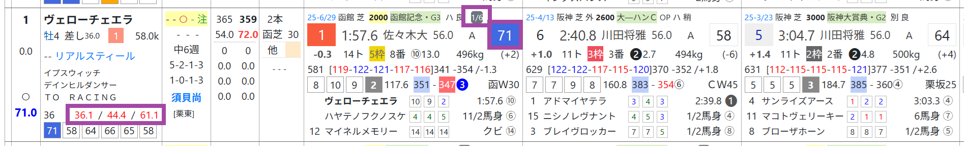 ヴェローチェエラは函館記念で「ハイブリッド指数」=《71》をマークしてⅤ、今回の出走馬の6頭の中では最先着、須貝厩舎は札幌の芝の勝率36%&複勝率61%と秀逸。
