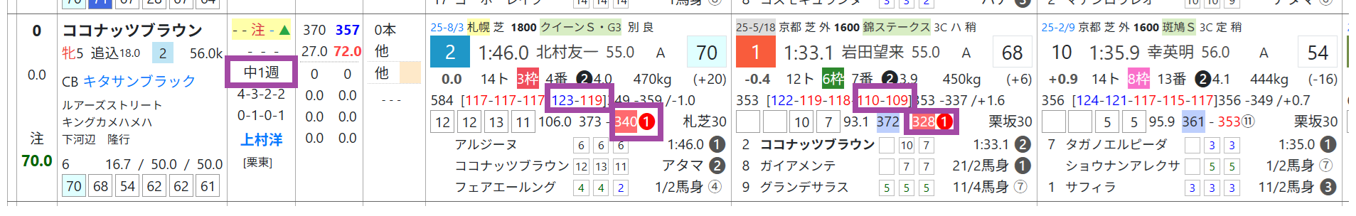 ココナッツブラウンは近2走は上がり最速をマーク、レース全体のラスト2ハロンの加速ラップは優秀、中1週で当週の「追切指数」がポイント。