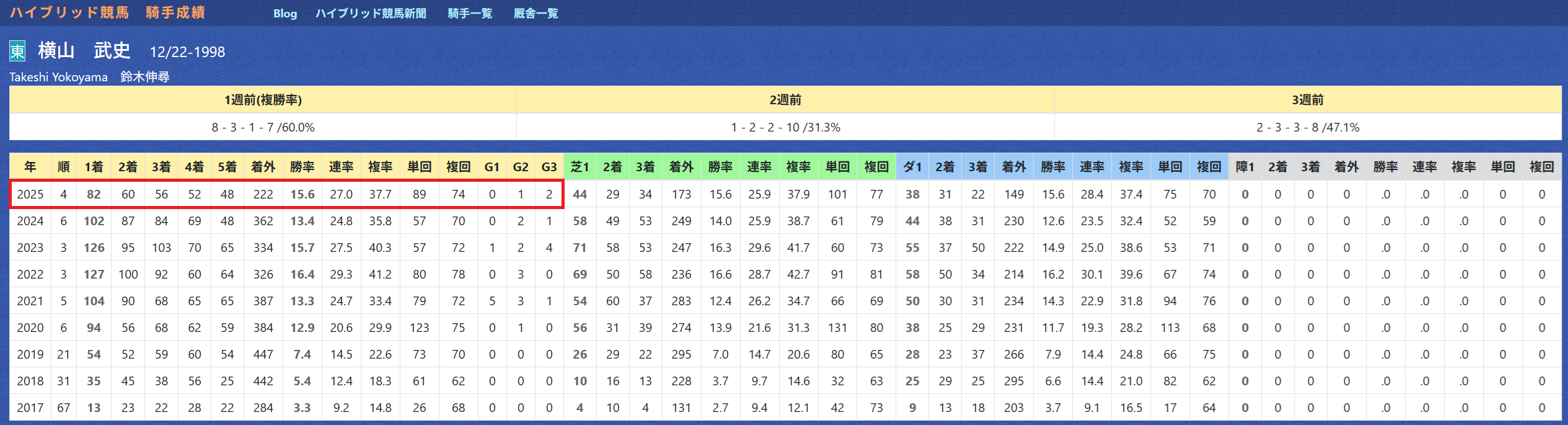 2025年09月02日 【データ分析】横山武史騎手 【横山武史騎手】先週は札幌で8勝の超固め打ち。リーディング4位まで浮上。年度別成績→トップページからログイン→「HBビューワ」→「騎手成績」※会員登録(無料)で利用可能夏の札幌リーディングを独走。札幌リーディング→トップページからログイン→「HBビューワ」→「開催ビューワ」※会員登録(無「開催ビューワ」⇒「インスタグラム」「ツイッター」にて他情報も更新中 「データ分析」カテゴリの最新記事