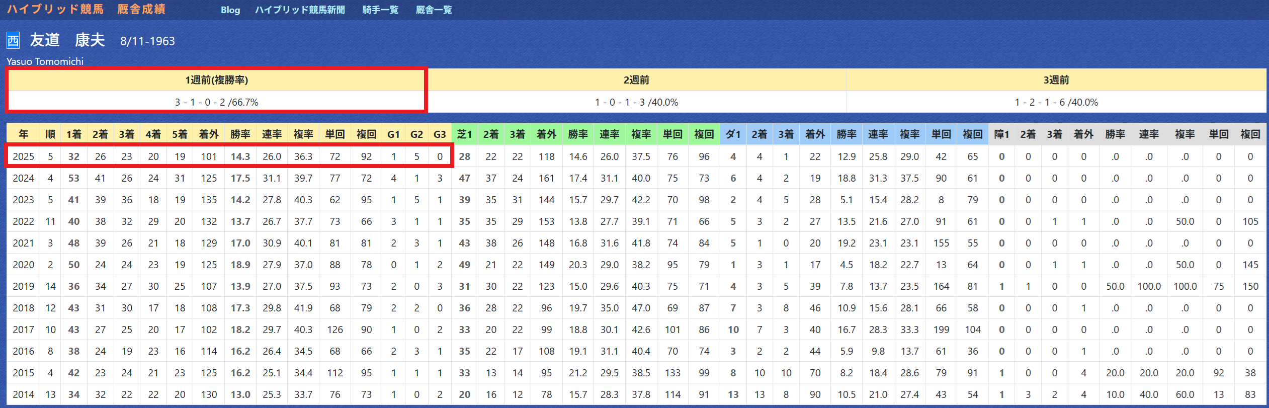 2025年09月16日 【データ分析】友道康夫厩舎 【友道康夫厩舎】ローズSをカムニャックでⅤ。今年の重賞6勝目。年度別成績芝のGⅡ以上は勝率37%&複勝率62%と驚異的。神戸新聞杯のショウヘイ&ライトトラック、オールカマーのヨーホーレイクもチャンス。芝のGⅠ・GⅡの成績→トップページからログイン→「HBビューワ」→「厩舎成績」※会員登録(無料)で利用可能⇒「インスタグラム」「ツイッター」にて他情報も更新中 「データ分析」カテゴリの最新記事