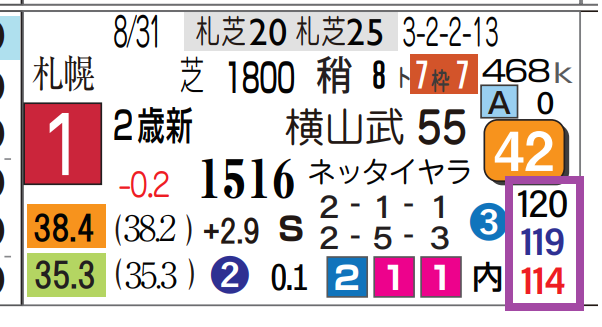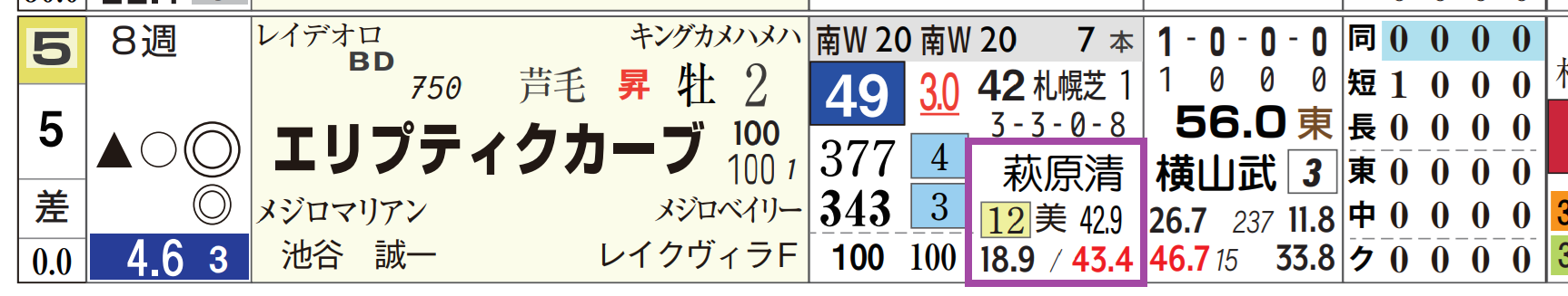 2025年11月02日 【レース予想】東京8R・百日草特別(2歳1勝クラス) 【東京8R・百日草特別(2歳1勝クラス)】⑤エリプティクカーブは初戦は札幌でラスト1ハロンが11秒台前半と優秀。「レースラップのラスト3ハロン」=12.0秒-11.9秒-11.4秒萩原厩舎は東京の芝の複勝率40%超えと優秀。「厩舎の該当競馬場の成績」=勝ち数12位、勝率18.9%&複勝率43.4%⇒「インスタグラム」「ツイッター」にて他情報も更新中 「レース予想」カテゴリの最新記事