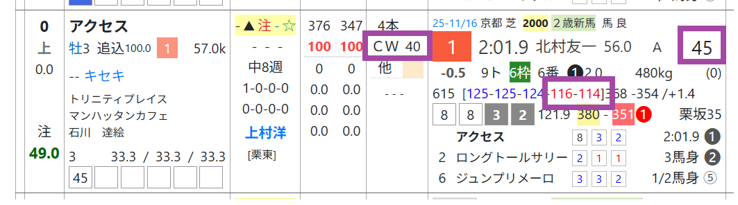 アクセスは新馬戦のラスト1ハロン11秒台前半、「ハイブリッド指数」=《45》をマークして1着、CWで1週前の「追切指数」=《40》と優秀。