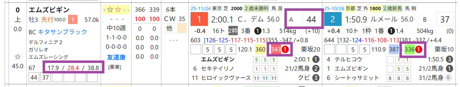 エムズビギンは未勝利勝ちが「レースレベル」=《A》&「ハイブリッド指数」=《44》、2戦ともに上がり最速をマーク、友道厩舎は京都の芝の連対率が28%と上々。