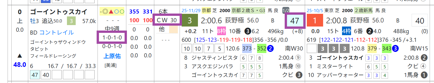 ゴーイントゥスカイは2戦1勝&3着1回、京都2歳Sで「ハイブリッド指数」=《47》をマークして3着、1週前の「追切指数」=《30》と上々。