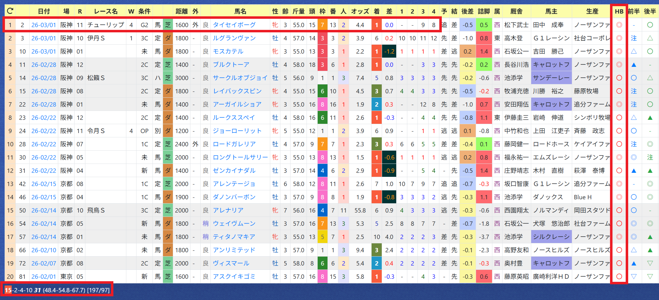 2026年03月02日 【データ分析】西村淳也騎手 【西村淳也騎手】チューリップ賞をタイセイボーグで制覇。年度別成績「ハイブリッド指数」2番手以内は勝率48%&複勝率67%、単勝回収率197%の好成績。「ハイブリッド指数」2番手以内の成績→トップページからログイン→「HBビューワ」→「騎手成績」※会員登録(無料)で利用可能⇒「インスタグラム」「ツイッター」にて他情報も更新中 「データ分析」カテゴリの最新記事
