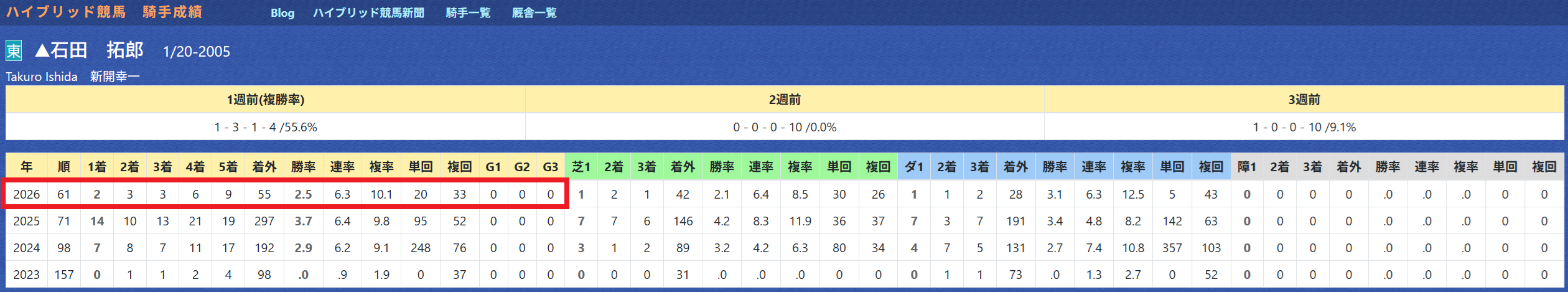 2026年03月03日 【データ分析】石田拓郎騎手 【石田拓郎騎手】デビュー4年目で通算20勝超え。年度別成績先週は9回の騎乗で3着以内が5回と大活躍。先週の成績→トップページからログイン→「HBビューワ」→「騎手成績」※会員登録(無料)で利用可能⇒「インスタグラム」「ツイッター」にて他情報も更新中 「データ分析」カテゴリの最新記事
