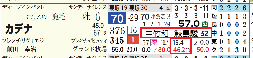 カデナは鮫島駿騎手が騎乗。中竹厩舎とのコンビでは好成績。