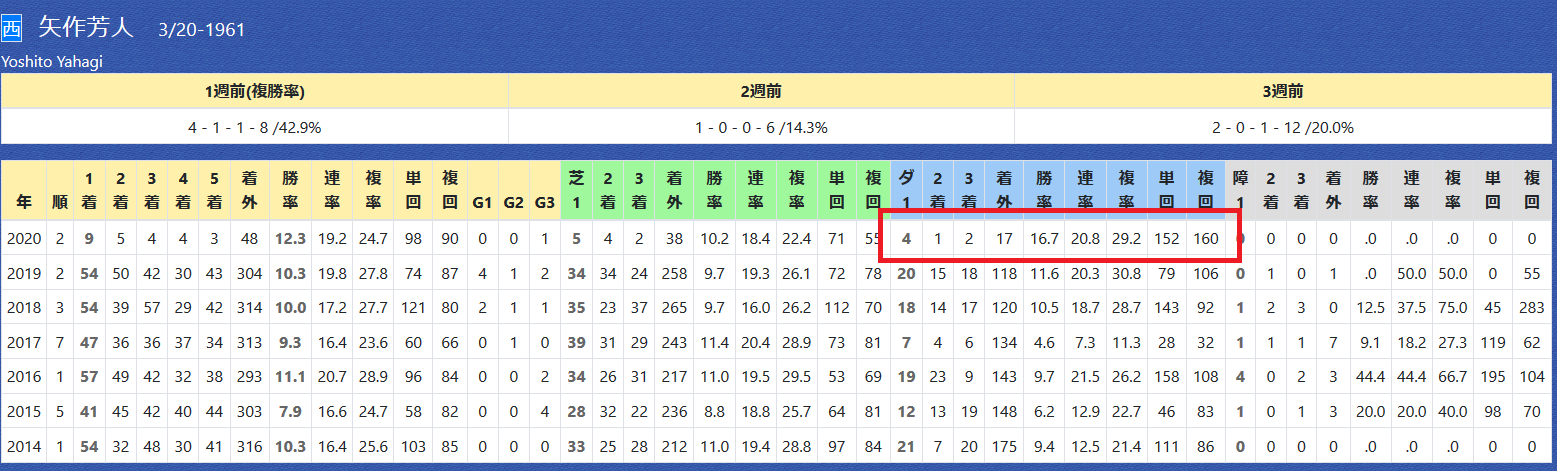 「厩舎の該当競馬場の成績」=勝率21.4%&複勝率42.9%
