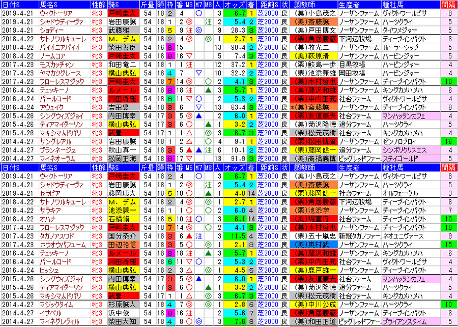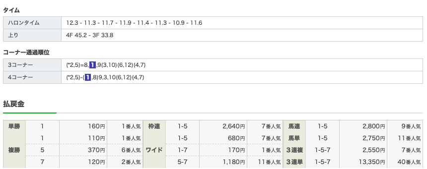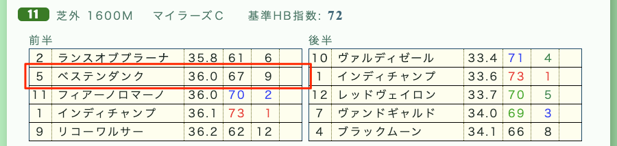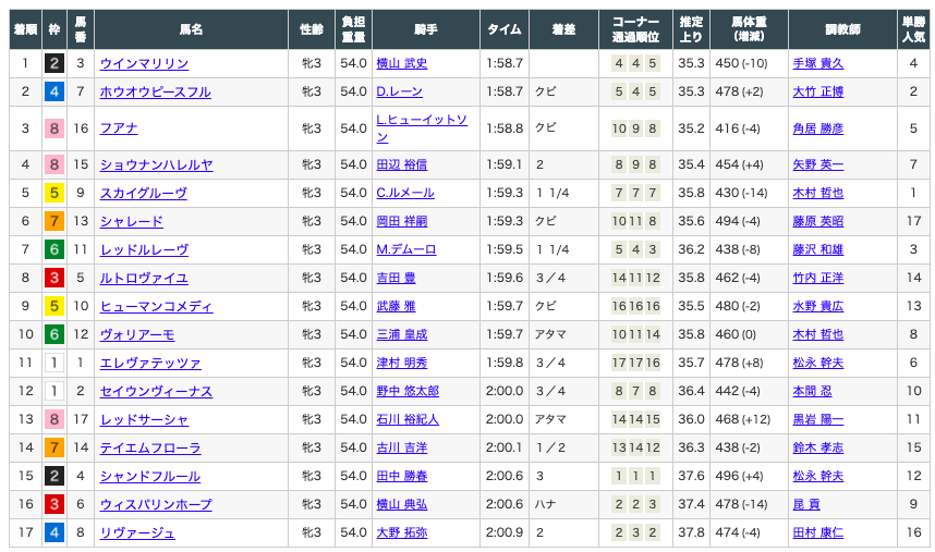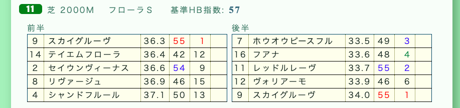 過去5年の前後半3ハロンの平均は36秒6-34秒8、1秒8の後傾ラップ。3歳牝馬にとって長めの距離、長い直線を意識されてか、後傾1秒7以上のスローペースが4回もある。