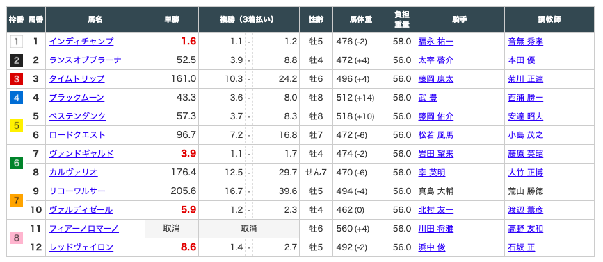 ①インディチャンプが単勝1倍台の断然人気。⑩ヴァルディゼールは単勝5倍超えの3人気。