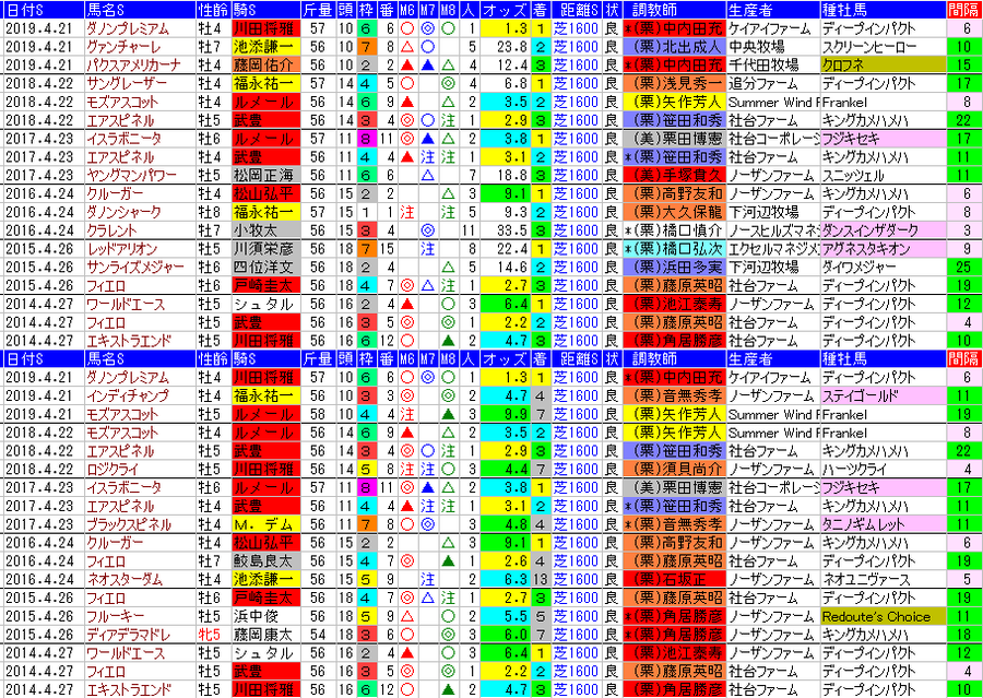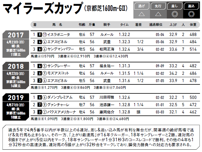 18年サングレーザーが1分31秒3のコースレコードで勝利。その他の4年も1分32秒台の高速決着。連対馬の5頭が上がり32秒台をマークしており、瞬発力勝負への対応力も要求される。