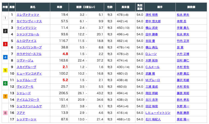 ⑨スカイグルーヴが単勝2倍台前半のやや抜けた1人気。⑦ホウオウピースフルが単勝4倍台の2人気。⑯フアナが単勝10倍超えと妙味あり。