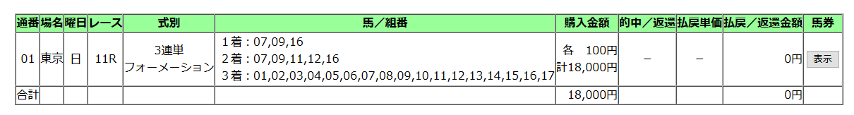 ⑩ヴァルディゼールから3連単フォーメーションで購入(購入間際に⑪が馬体検査)。