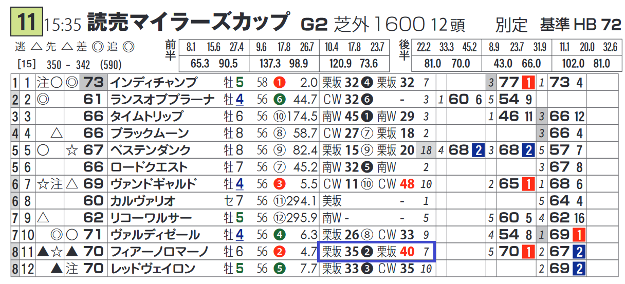 ⑩ヴァルディゼールが中心。相手本線は①インディチャンプ。⑫レッドヴェイロン、⑦ヴァンドギャルド、⑪フィアーノロマーノが連軸候補。