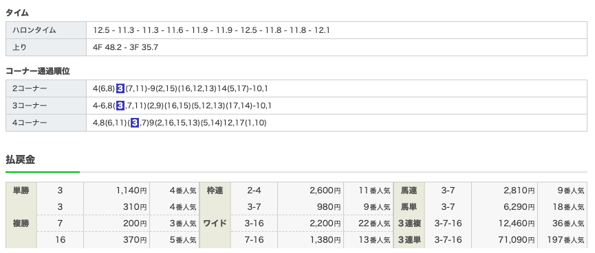 ⑨スカイグルーヴは好位をスムーズに追走。直線半ばまで持ったままだったが、追い出してからサッパリ伸びず。明らかに馬体減が影響している…。⑦ホウオウピースフル、⑯フアナが追い込んで2着に入るが、3連単の順番違いでハズレ。