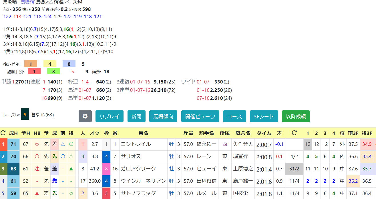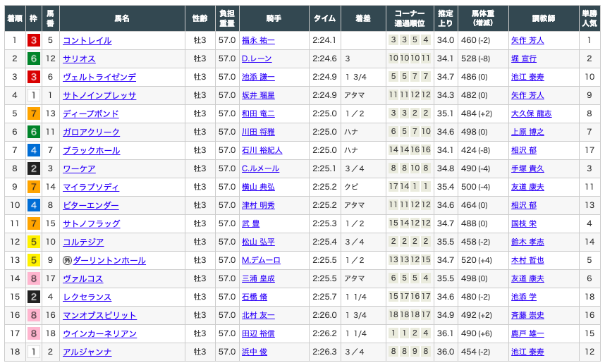 先週のオークスは「推定後半3ハロン」1位の④デアリングタクトが4戦無敗で2冠を達成。いよいよ本日は日本ダービー。5戦無敗でコントレイルが2冠達成なるか。