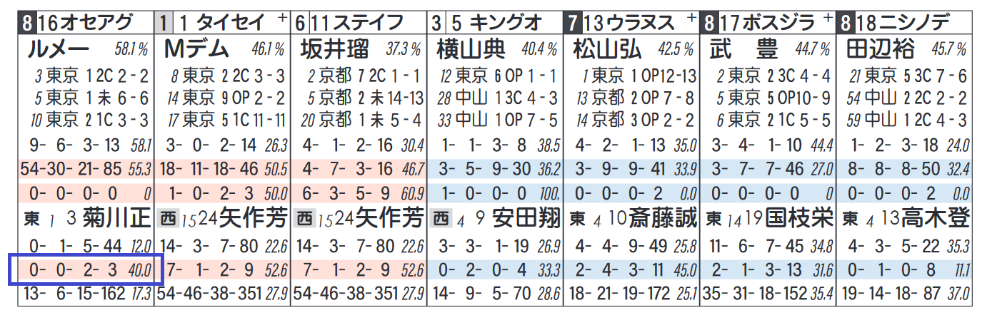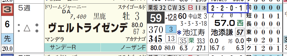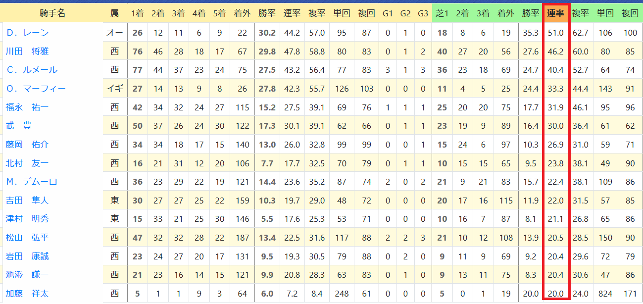 「厩舎の該当競馬場の成績」=勝ち数2位、勝率20.5%&複勝率43.8%