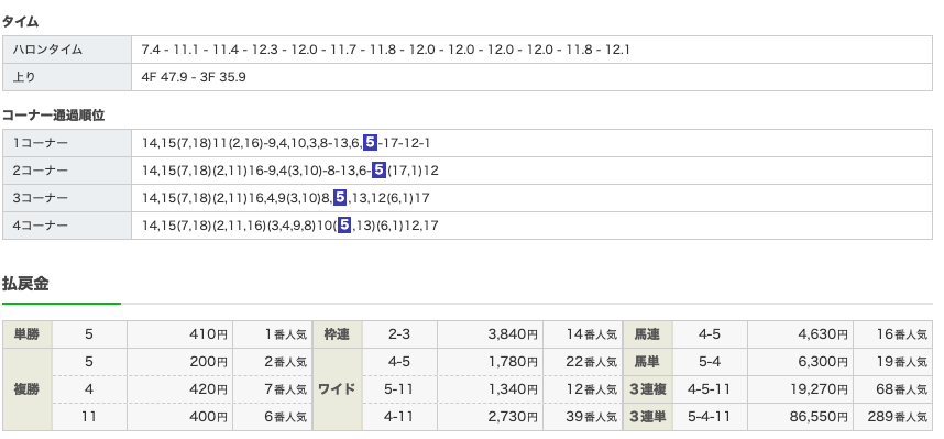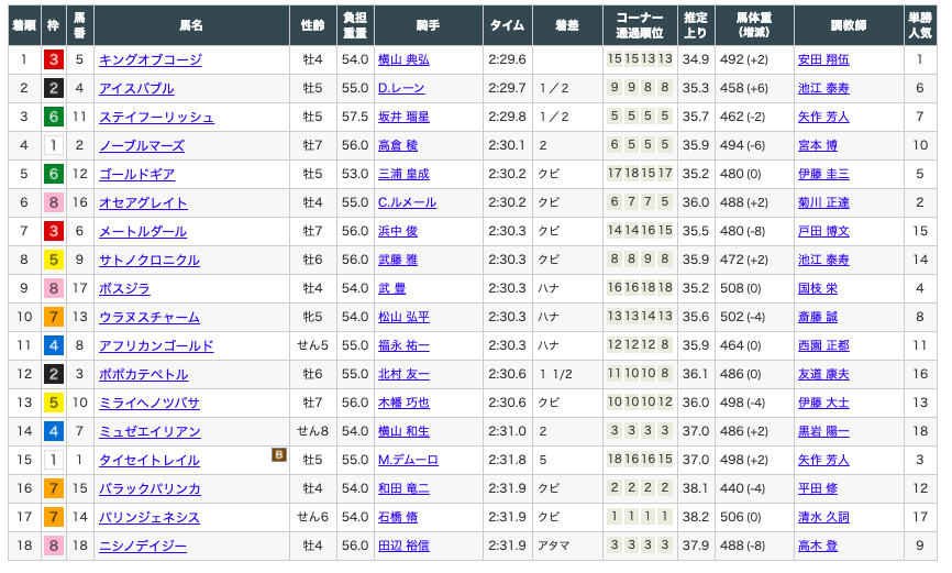 ⑤キングオブコージは後方に控える形。直線は馬群を捌いて伸びてきて、④アイスバブルとの叩き合いを制する。レーン騎手は2重賞とも2着。3着の⑪ステイフーリッシュも人気薄で、馬連「4630円」&3連複「19270円」がダブル的中。14万円超えの払い戻し。